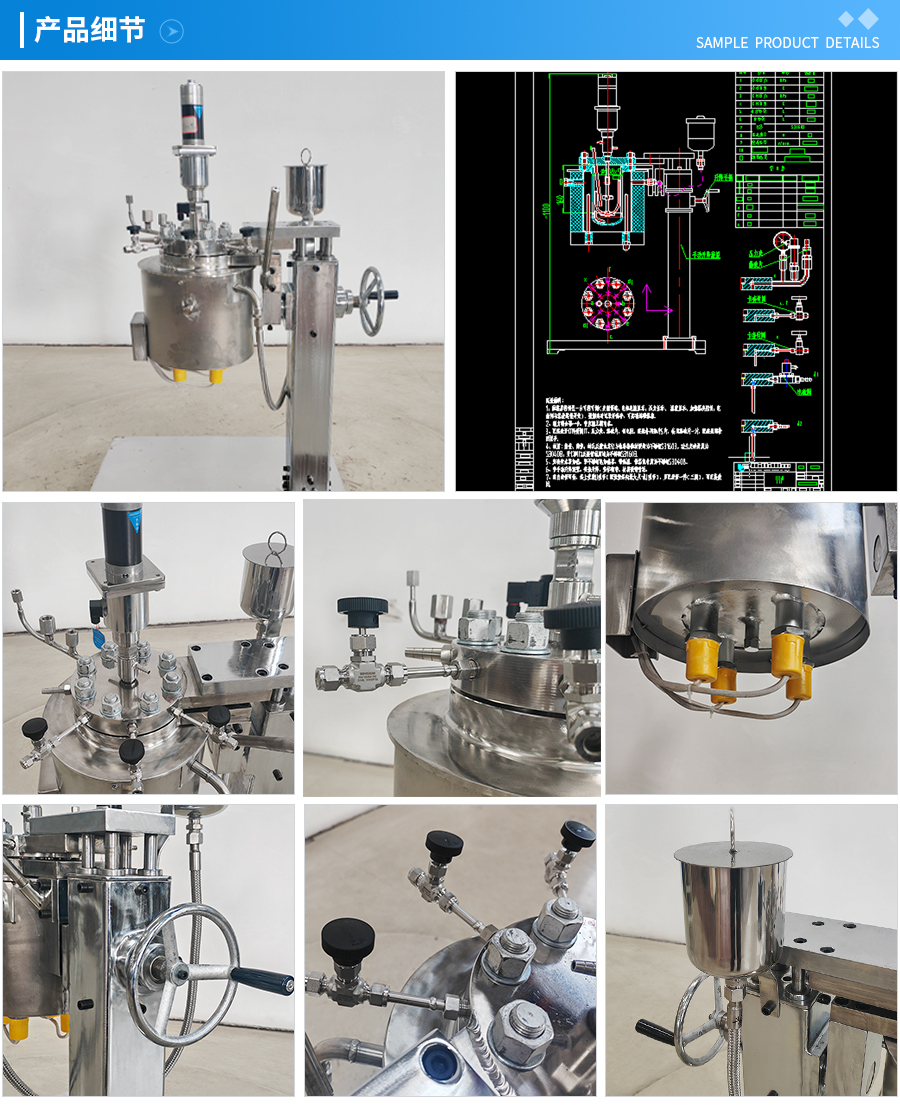 常規(guī)釜蓋開口 氣相口配針形閥,液相口配針形閥及釜內(nèi)插底管,固體加料口配絲堵,測控溫口配鉑電阻,壓力表安全爆破口配壓力表及安全防爆裝置,釜內(nèi)冷卻盤管進、出口配水咀