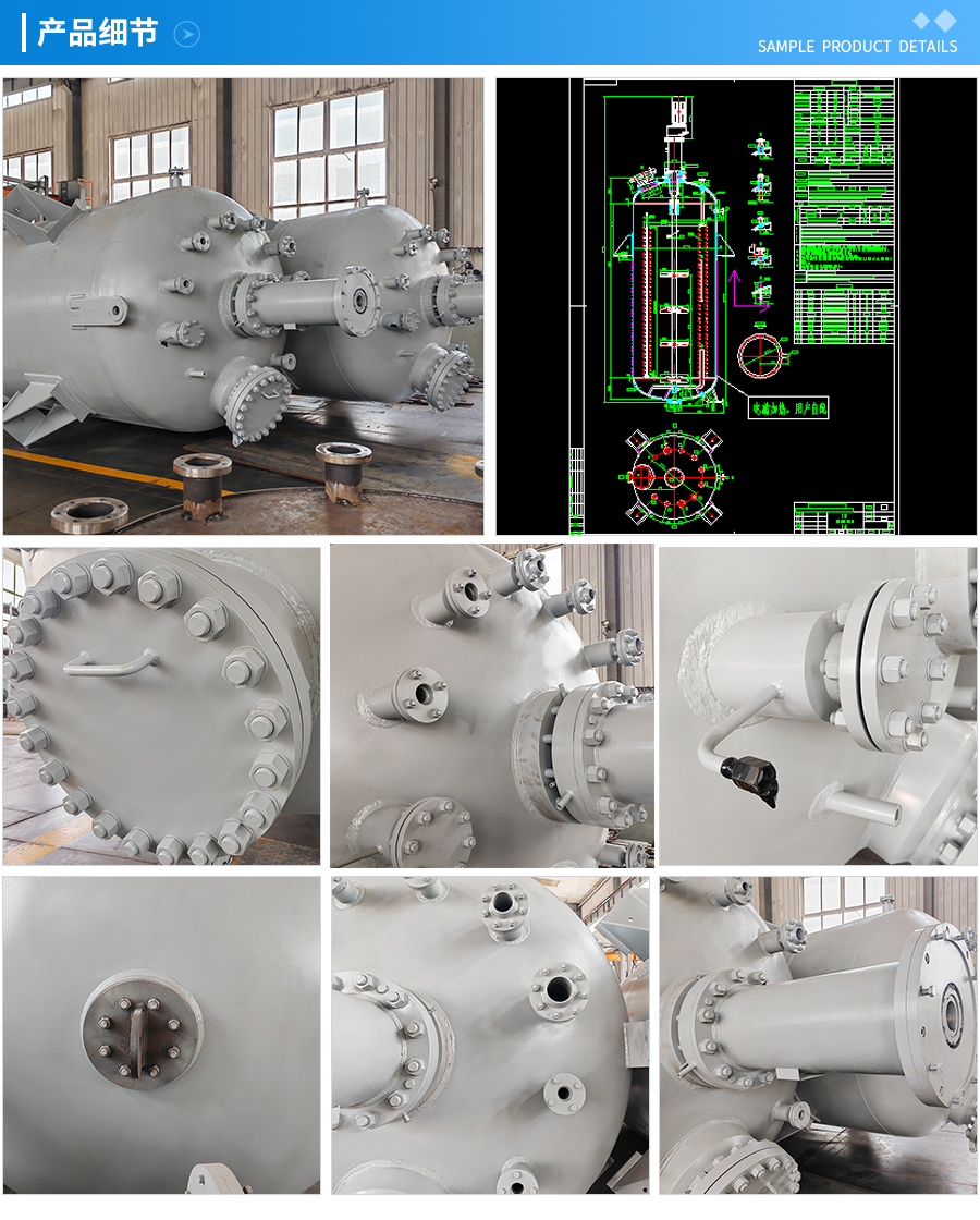 主要材料 釜體材料主要采用不銹鋼與碳鋼復(fù)合材質(zhì) S30408(304)+Q345R、S31603(316L) +Q345R、S32168(321)+Q345R, 也可是純不銹鋼材質(zhì),并可根據(jù)不同介質(zhì)要求制作鈦材、鎳材、鋯材、哈氏合金、蒙耐爾合金等復(fù)合材質(zhì)反應(yīng)釜,也可根據(jù)客戶要求主要材料噴涂四氟PTFE/PPL。